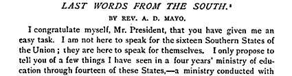 In this speech, delivered at the National Educational Convention in Madison, Wisconsin, in 1884, the Massachusetts minister Amory Dwight Mayo offers an optimistic look at the educational situation of Southern African Americans. Recalling experiences from his four-year "ministry of education" through fourteen Southern states, Mayo provides several "notes of hope and cheer."