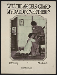 Also uniquely American is the frequent appearance of service flags. Beginning in the First World War (and continuing to the present day) families of servicemen displayed flags or banners bearing a blue star for each member in the service; if a member died while serving, their blue star would be replaced by a gold one. The many songs of blue stars, gold stars and blue-turned-to-gold commemorate service and sacrifice of not just the servicemen, but also their families. These songs, as many of the home and hearth songs, can range from dignified to cloyingly sentimental, as in "We Loaned the Most of All", which recounts the story of a small boy who plans to build an airplane he can fly to heaven to be with his daddy.