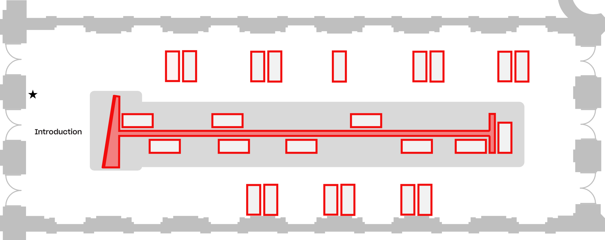 The exhibition is organized in a loop. We recommend starting your visit here, entering straight ahead, and then walking around the exhibition in a clockwise direction until you return to the entrance. The exhibition includes six sections and twenty-four rectangular display cases.
