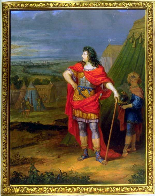 The Dutch War (1672–78), during which Louis XIV demonstrated strategic and tactical capabilities, provided the occasion for a skillful propaganda campaign by his historian-poets Boileau (b. 1636–d. 1711) and Racine (b. 1639–d. 1699). The war also produced the Campagnes de Louis XIV which contains maps of the operations and movements of French troops. Louis is illustrated here at the beginning of the volume dressed as a Roman emperor.