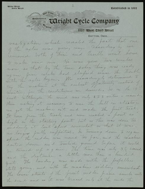 Wilbur Wright to Katharine Wright, December 14, 1903. Page 2 - Page 3. Holograph letter. Wright Papers, Manuscript Division, Library of Congress (72)