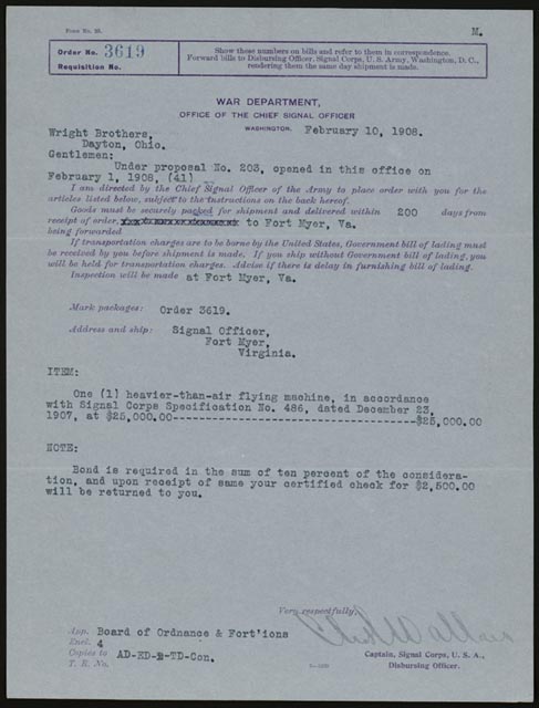 U.S. Signal Corps.War Department Purchase Order, February 10, 1908. Wright Papers, Manuscript Division, Library of Congress (93)