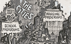With a heavy sword smashing into cities already riddled with poverty, Herblock criticizes Congress for bludgeoning American cities with budget cuts. When the Johnson administration called for a tax increase, Congress and the business community, citing expenses of the Vietnam War, requested reductions in appropriations that directly affected the urban poor. Martin Luther King, Jr., saw the Vietnam War “as an enemy of the poor,” arguing that Congress had “eviscerated” the program.