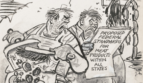 Using irony to reinforce his opinion that the meat industry needed improvement, Herblock advocated for U.S. Senator Walter Mondale’s proposed federal regulation to close loopholes in the existing meat safety legislation, the Federal Meat Inspection Act of 1907. Ralph Nader (b. 1934), a public interest attorney, supported new legislation, arguing that industry practices exposed consumers to contaminated food. President Johnson signed the Wholesome Meat Act of 1967 into law on December 15, 1967. Both Nader and author Upton Sinclair were present for Johnson’s signing. Sinclair’s novel The Jungle (1906) had led to the initial meat industry reforms.