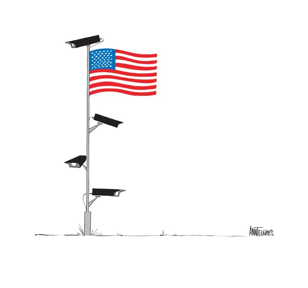 Telnaes drew this cartoon on the eve of Flag Day, a traditional celebration in the United States. In the post-September 11 United States, Telnaes's flag is surrounded by cameras, whose presence indicates the Bush Administration's preoccupation with surveillance, a practice being defended as patriotic even when it infringes on civil liberties.