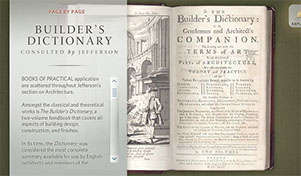 Examine the featured book in the “Imagination” (Fine Arts) section and view the pages of The Builder’s Dictionary, an eighteenth-century handbook that details aspects of building design, construction, and finishes.