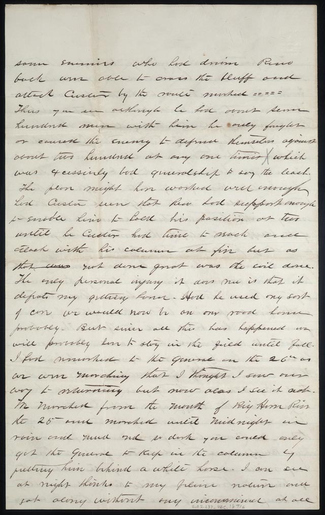 As the military stepped up its efforts at removing Indians from lands desired by white settlers, Native American tribes focused their attacks on soldiers. On June 25, 1876, George Armstrong Custer and 264 men of the 7th U.S. Cavalry were slaughtered by Teton Dakota/Sioux and Cheyenne along the banks of the Little Bighorn River in southeastern Montana. Although Custer's conduct is still in dispute, this map and accompanying letter by Lt. Robert Patterson Hughes, an aide-de-camp to expedition commander Major General Alfred Terry, strongly supports the theory that Custer acted recklessly—not only disobeying orders by engaging the enemy before help had arrived but by splitting his command into thirds in the face of overwhelming odds.