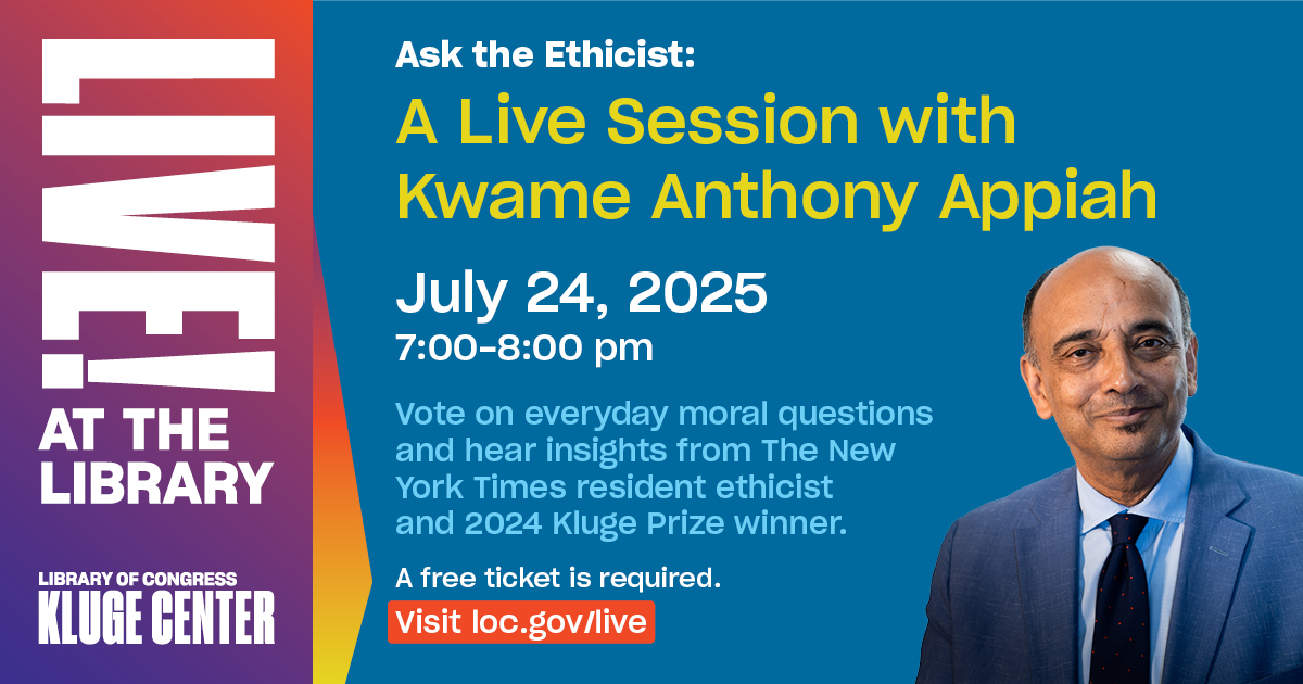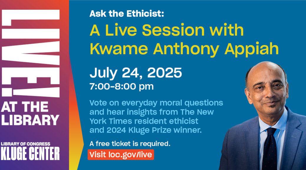 Visitors are invited to a special evening with Kwame Anthony Appiah, the 2024 recipient of the John W. Kluge Prize for Achievement in the Study of Humanity, during Live! At the Library in July. During this engaging event on July 24, attendees will navigate compelling real-world moral and ethical dilemmas and cast their votes based on challenging scenarios.Also during Live! At the Library, visitors…